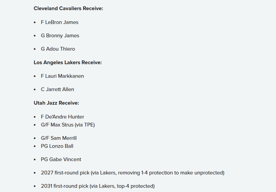 爵士得到:亨特+斯特鲁斯+梅里尔+鲍尔+文森特+2027年湖人首轮(取消前四保护,成为无保护首轮)+2031年湖人前四保护首轮。